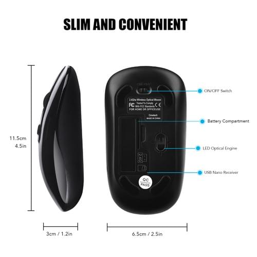 ● Ultra-Slim and Portable: Wireless mouse with a simple slim ergonomic design, measuring about 2.5x1.2x4.5 inches. The ergonomic mouse fits snugly in your palm, handbag, and computer case, making it easy to carry around.